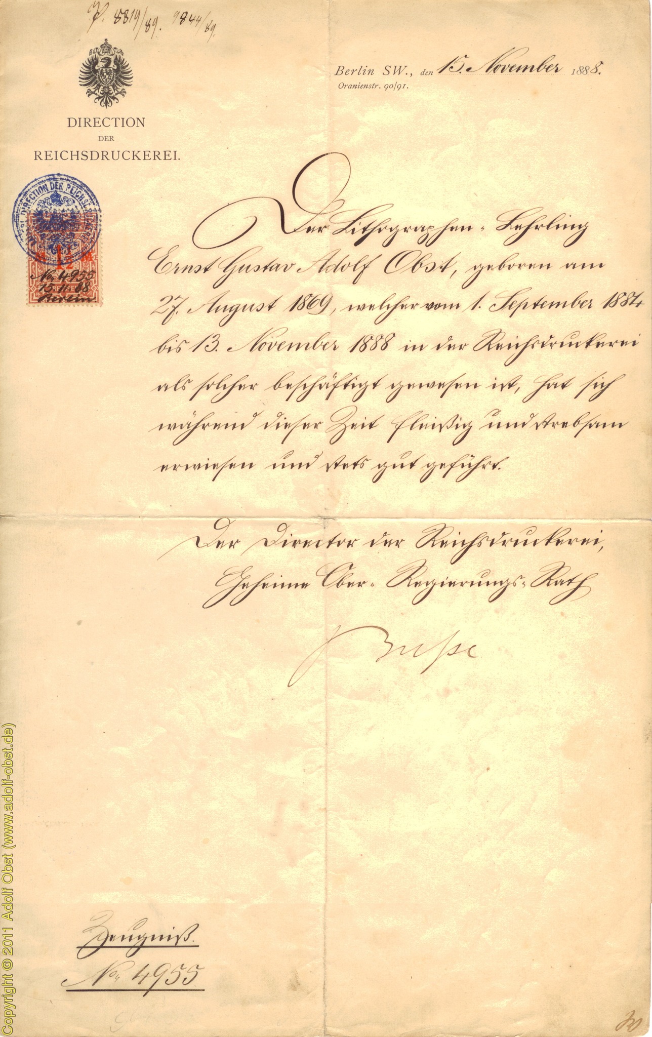 Mit 14 Jahren Lehrling in der chalkographischen (Wort stammt aus Lebenserinnerungen) Abteilung der Reichsdruckerei in Berlin. Vier Jahre lang Ausbildung in graphischen Künsten, namentlich der Lithographie und des Kupferstichs.