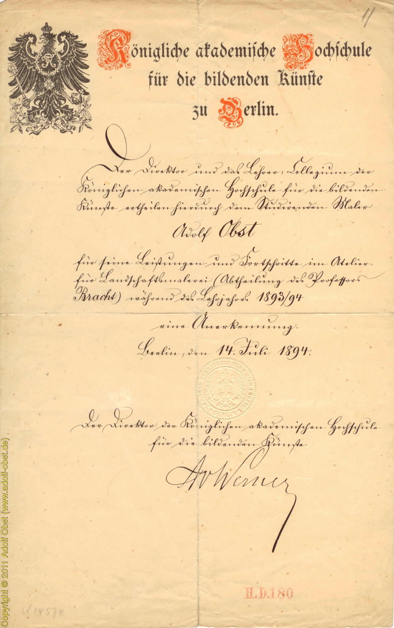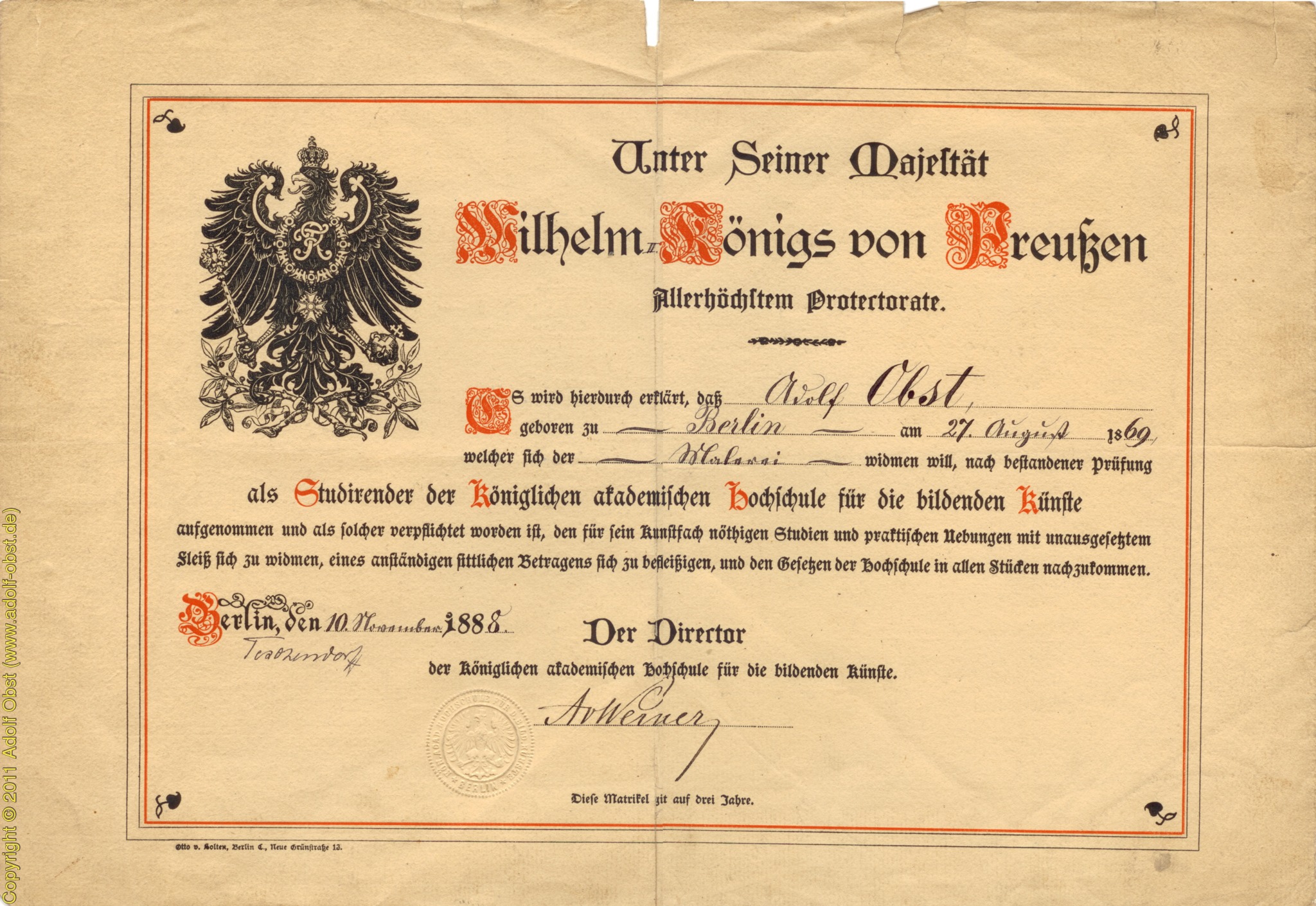 Vorstellung beim seinerzeit bekannten Direktor der kgl. akadem. Hochschule für die bildenden Künste Anton von Werner. Bestehen der Aufnahmeprüfung (von 70 Bewerbern wurden 20 genommen) und Immatrikulation.