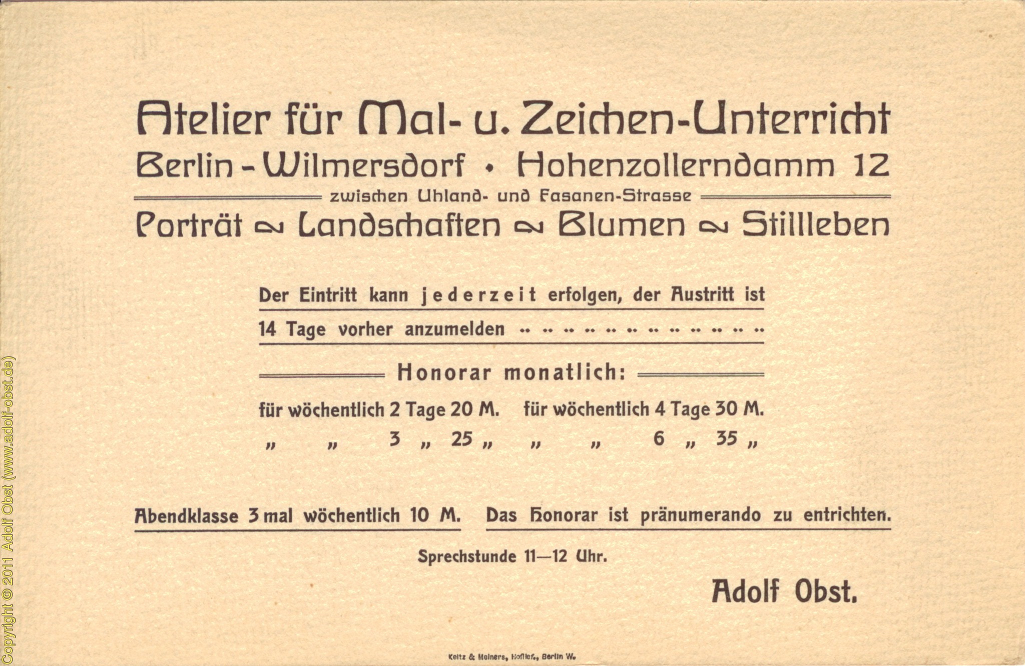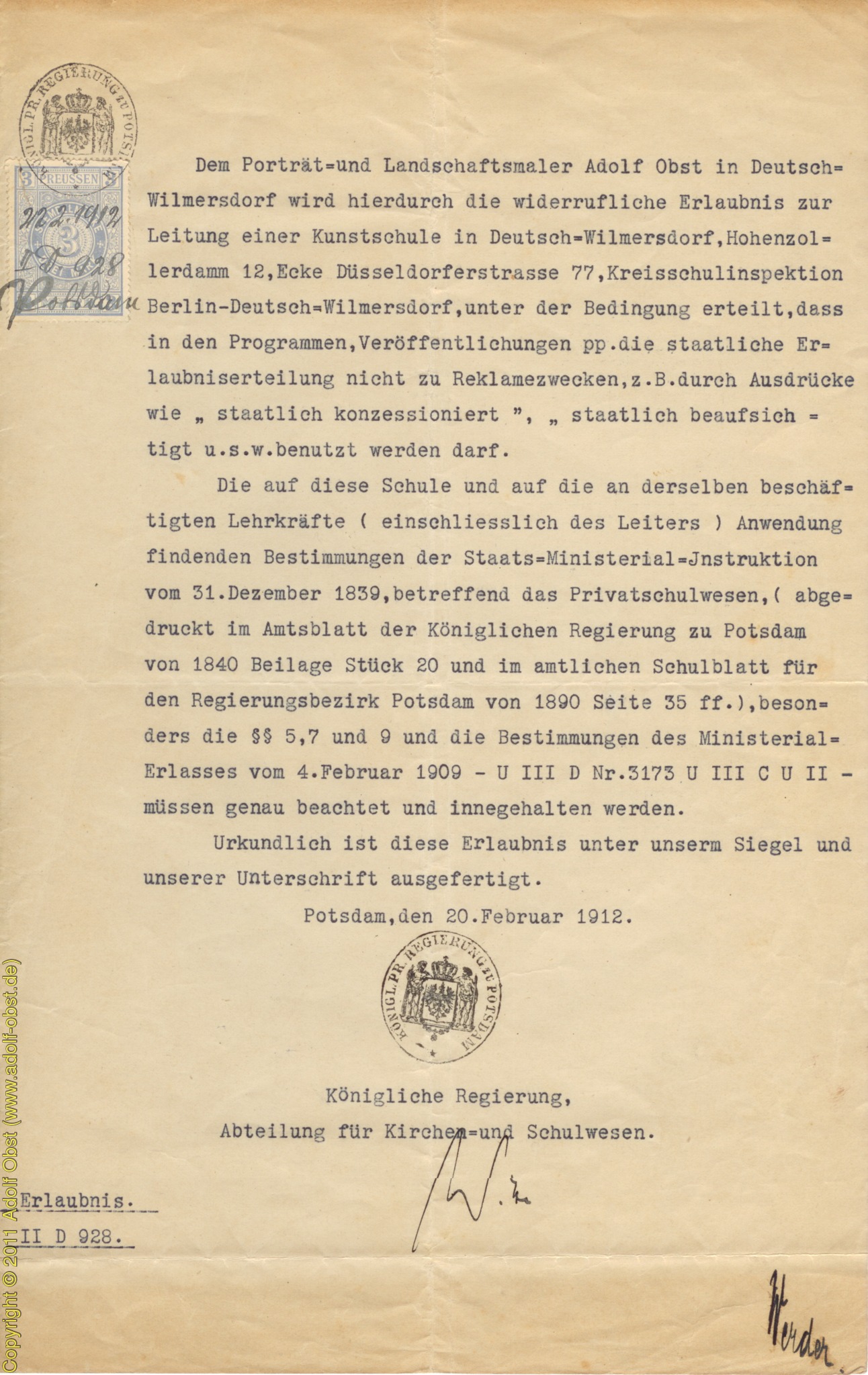 Erlaubnis vom 20. Februar 1912 der kgl. Regierung zum Betreiben einer Kunstschule Hohenzollerndamm 12, Berlin.